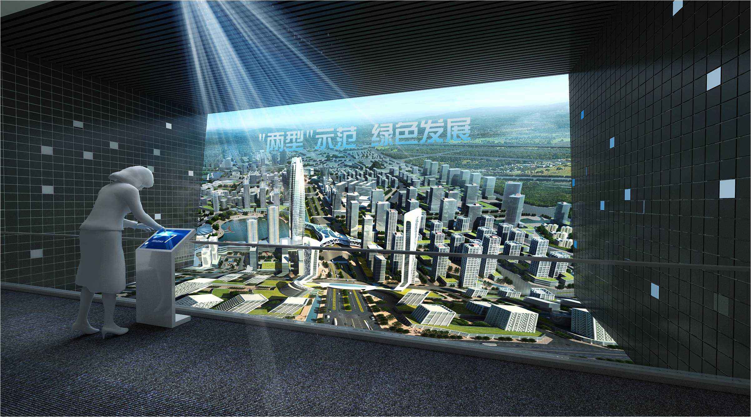 4、將圖像、動畫、解說、音樂等多種元素很好的融合在一起,以多媒體解說為主線,使設計方案、表現效果圖、三維模擬動畫與實體模型產生相互對應,解說到某一建筑,顯示屏上出現本建筑的各種資料,同時在實體模型上用燈光來表達這個建筑,這將會給觀眾產生更為深刻的印象。